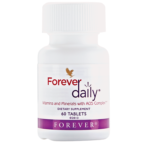 Вітамінний заряд і сила алое. Форевер Дейлі – це потужні полівітаміни, які ми посилили завдяки нашому ексклюзивному комплексу AOS Complex, в якому використовується алое, щоб максимізувати надходження поживних речовин до вашого організму. Навіть збалансований раціон може залишити прогалини в споживанні вітамінів. Форевер Дейлі надає простий спосіб заповнити ці прогалини. Наша суміш містить 55 вітамінів і мінералів з натуральних компонентів, щоб заповнити прогалини в харчуванні та допомогти вам виглядати і почувати себе краще. Але на цьому ми не зупинилися. Форевер Дейлі також включає нашу суміш FVX20, інноваційний синтез фітонутрієнтів і біофлавоноїдів, отриманих з фруктів і овочів. Правильне харчування – це не тільки потрібна кількість вітамінів, які ви приймаєте, а і те, наскільки добре ваш організм засвоює ці вітаміни. Наш ексклюзивний AOS Complex являє собою комбінацію полісахаридів алое, вітамінів, мінералів, амінокислот і алое, спеціально розроблену для поліпшення засвоюваності організмом поживних речовин. Форевер Дейлі – це відмінна добавка, яку можна приймати разом з Форевер Натур-Мін, нашою повною комплексною мінеральною добавкою, для забезпечення оптимального здоров’я і життєвої сили. Разом ви можете отримати ідеальну суміш вітамінів і мінералів, щоб доповнити збалансований, здоровий спосіб життя. Переваги • Ідеально збалансована суміш з 55 поживних речовин • Прекрасне рішення для заповнення прогалин в споживанні вітамінів • Ексклюзивний AOS Complex • Не містить глютену ВМІСТ УПАКОВКИ 60 таблеток